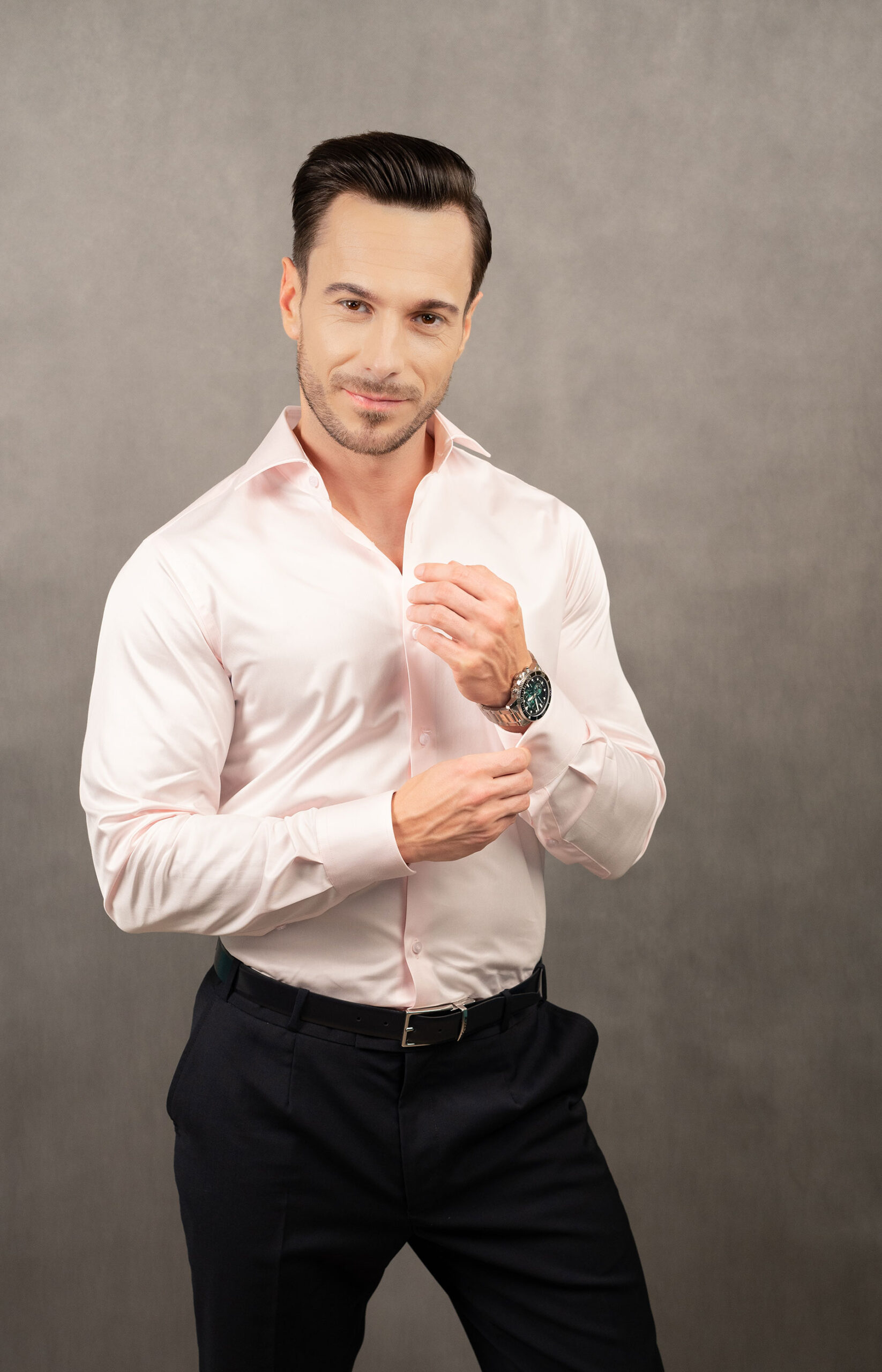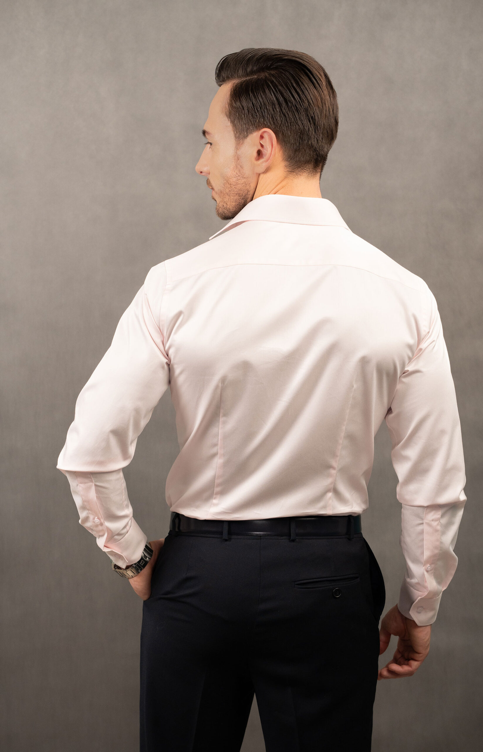 Klasyczna gładka różowa koszula z kołnierzem włoskim to propozycja dla miłośników łączenia ponadczasowej klasyki z nowoczesnością. Wybraliśmy jasnoróżowy odcień, tkaninę 100% bawełny i krój slim, co gwarantuje zarówno komfort, jak i stylowy wygląd.