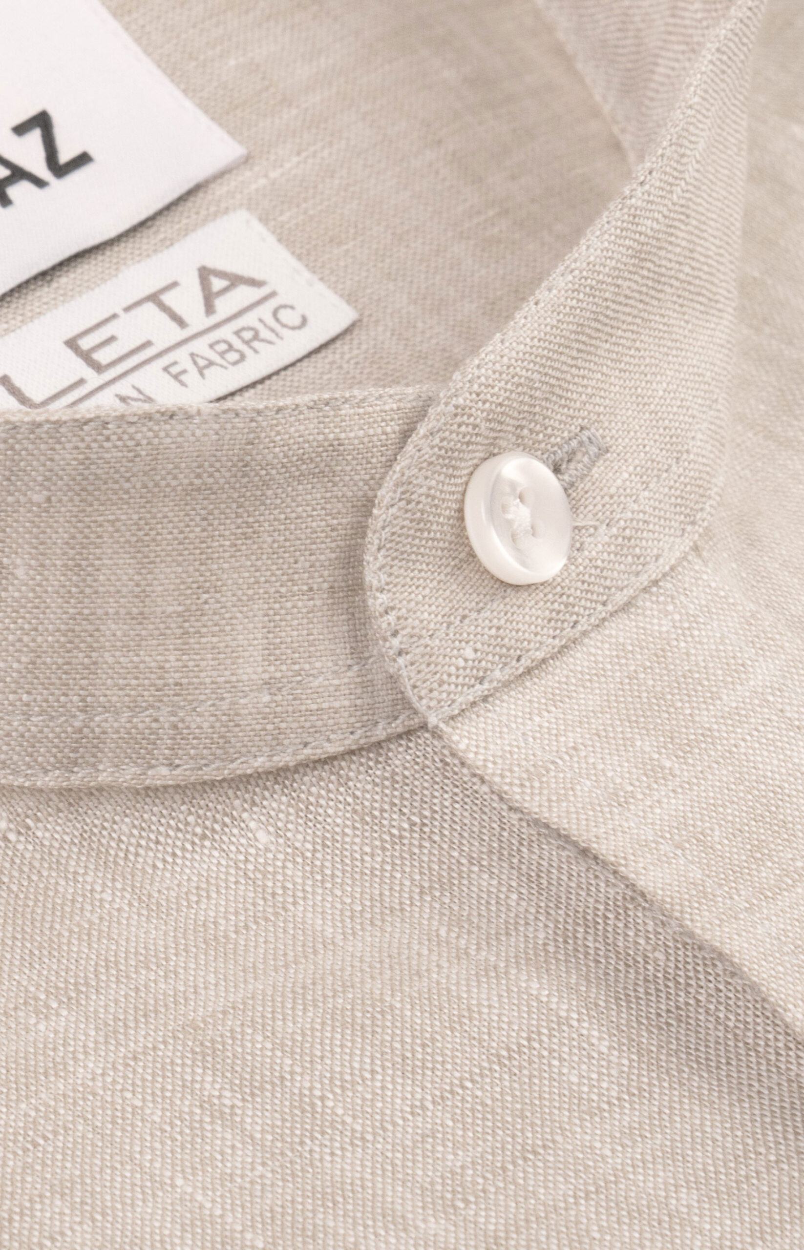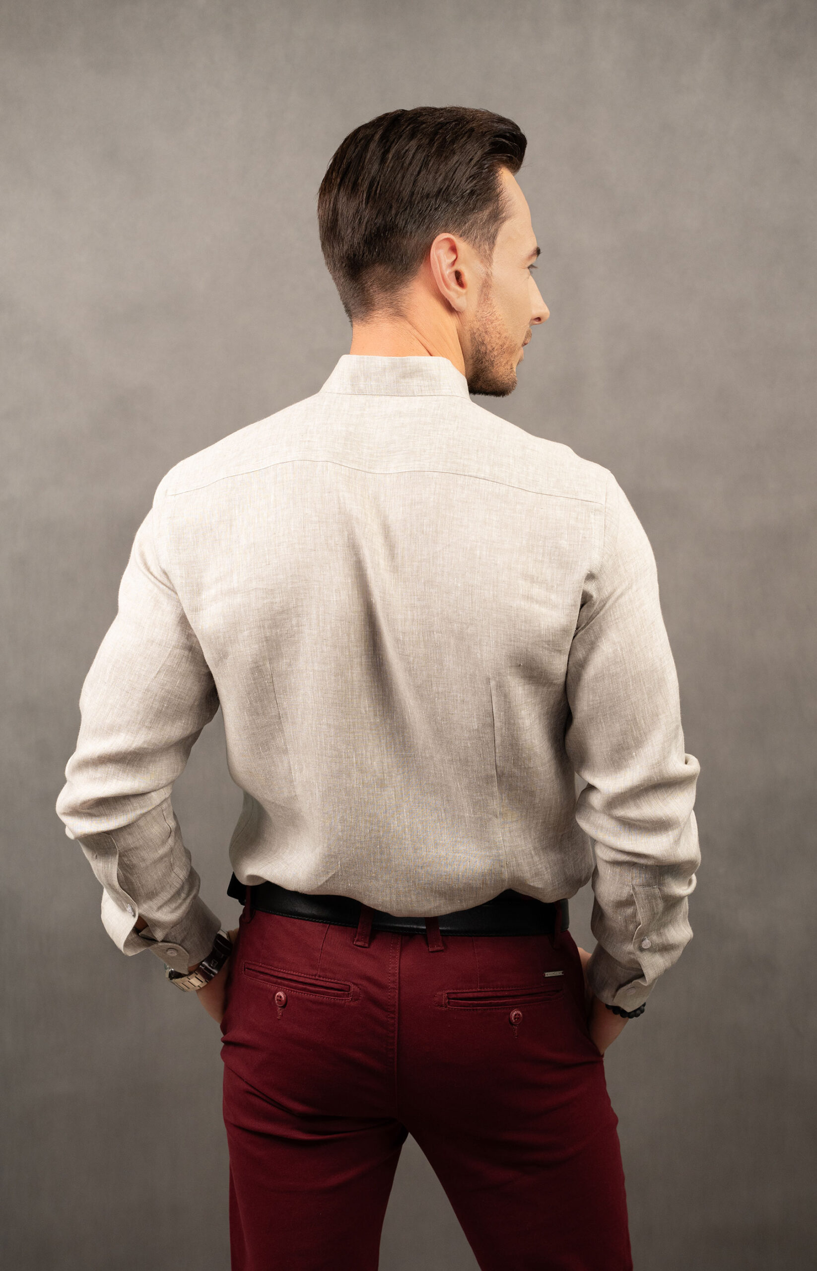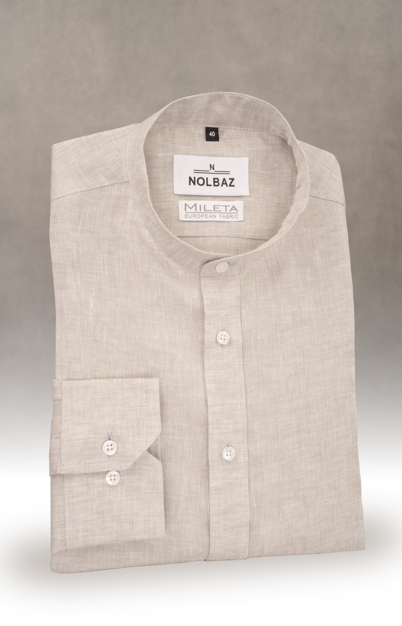 Lniana koszula męska na stójce w odcieniu naturalnym z tkaniny Mileta